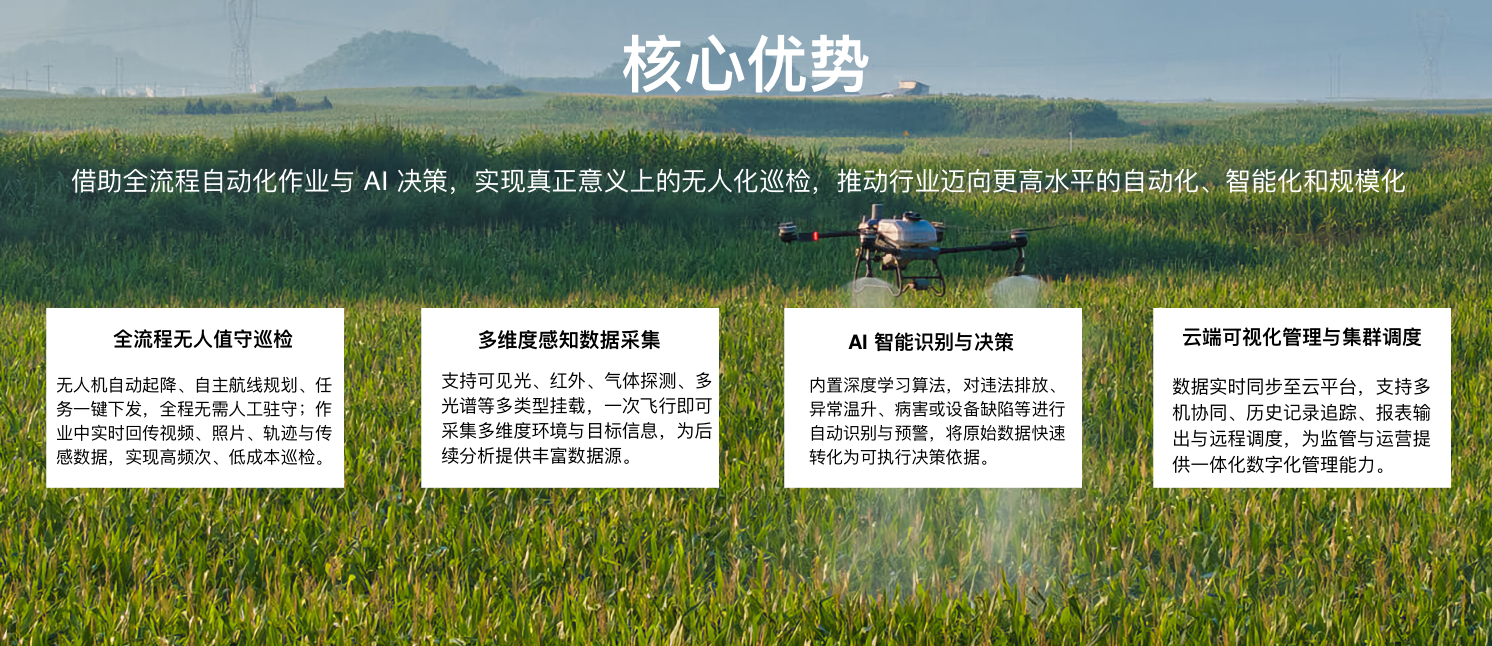 将无人机全流程无人值守巡检、多传感一次飞行采数、AI 智能识别预警与云端可视化调度融为一体,快速获取地上—地表—地下多维数据并即时转化为生产决策,使农林管理更高效、更精准、更低成本。