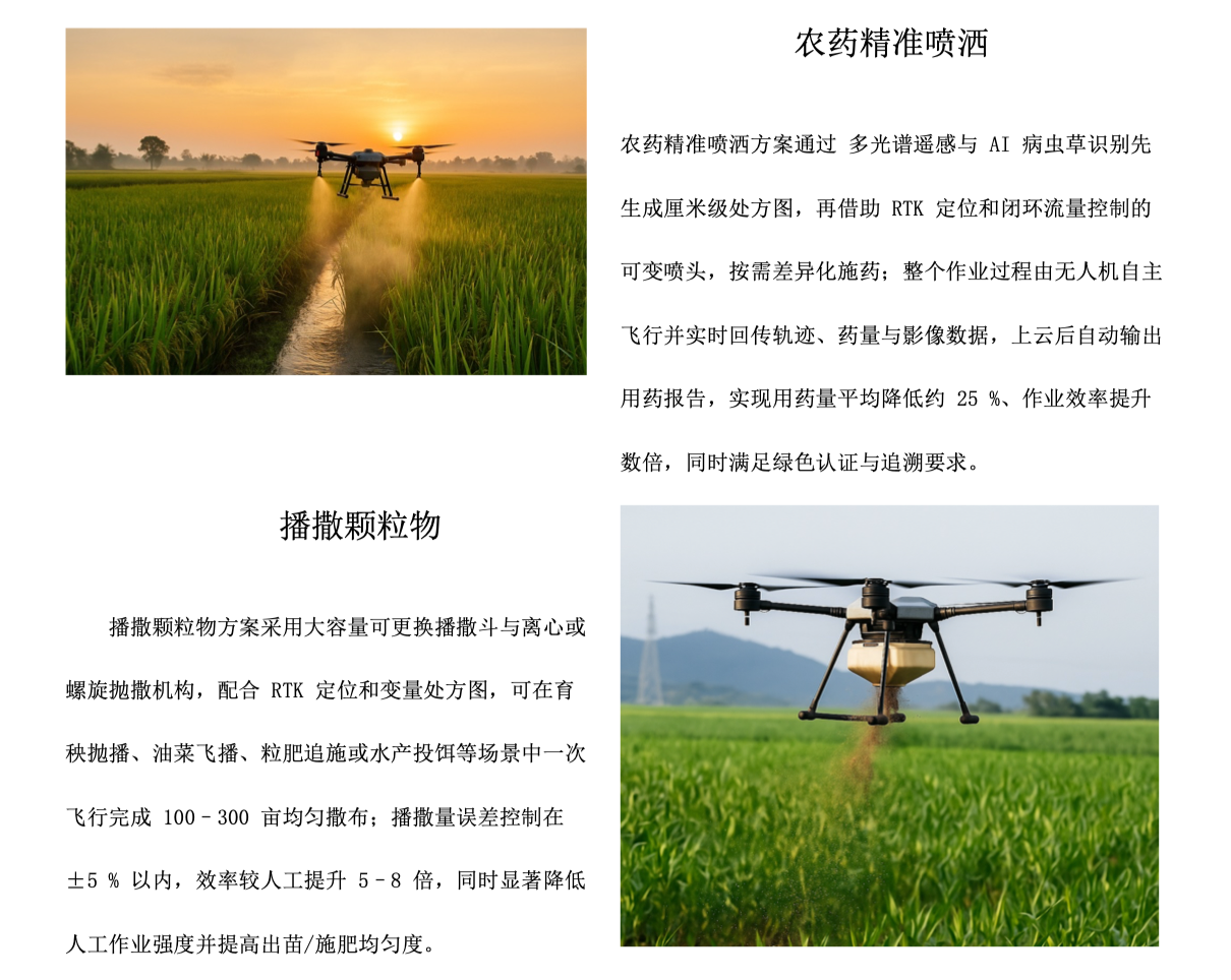 无人机农业植保解决方案将 AI 处方图生成、遥感诊断、多光谱监测、油电混合长航时平台与变量喷洒控制深度融合,形成“巡田—决策—施药—追溯”一体化解决方案。系统利用厘米级 RTK 定位和深度学习算法,对作物病虫草情与营养状态实时诊断并自动生成处方图;随后基于可按农田规模灵活选配的多型号飞行平台(从中型到重载型,续航与载药量均可扩展),通过闭环流量控制将喷洒误差控制在 ±3 % 以内,整体节省农药、肥料和用水 20–30 %,同时显著降低环境残留。全流程支持五向避障、云端数据闭环与无人值守机场,可单机作业或多机协同 7 × 24 小时连续防治,帮助种植者在不干预飞行细节的前提下显著提升作业效率、降低成本,并加速向数字化、低碳化农业转型。